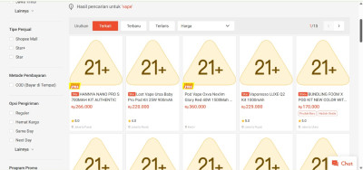 Kalian bisa pilih, mau login dulu atau langsung ketik kata kunci “vape” di kolom pencarian Shopee. Bedanya, kalau belum login, tampilan produk hanya akan muncul dengan gambar placeholder bertanda 21+.